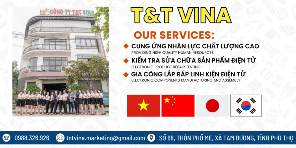 T&T VINA quản lý tất cả các quy trình kinh doanh của công ty dựa trên việc cung cấp dịch vụ gia công linh kiện điện tử và cung ứng nhân lực tốt nhất. Bằng cách tái cấu trúc, chúng tôi tìm cách cung cấp nhân lực hướng tới khách hàng phù hợp với nhu cầu của khách hàng .